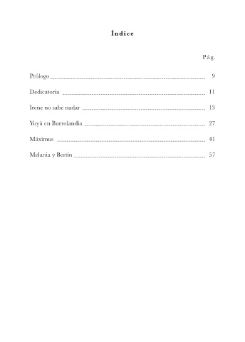 Índice Pág. Prólogo 9 Dedicatoria 11 Irene no sabe nadar 13 Yuyú en Burrolandia 27 Máximus 41 Melania y Bertín 57