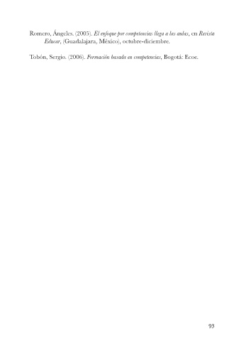 Romero, Ángeles. (2005). El enfoque por competencias llega a las aulas, en Revista Educar, (Guadalajara, México), octubre-diciembre. Tobón, Sergio. (2006). Formación basada en competencias, Bogotá: Ecoe. 93