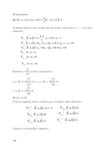 El lagrangiano Se deben satisfacer las condiciones de primer orden para λ = –1, un valor arbitrario. Entonces y la base ortogonal es: o, Y las de segundo orden, también para el mismo valor arbitrario. Entonces la matriz L es simétrica. 146