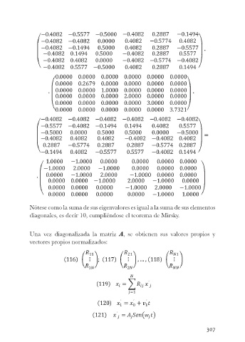 Nótese como la suma de sus eigenvalores es igual a la suma de sus elementos diagonales, es decir 10, cumpliéndose el teorema de Mirsky. Una vez diagonalizada la matriz A, se obtienen sus valores propios y vectores propios normalizados: 307