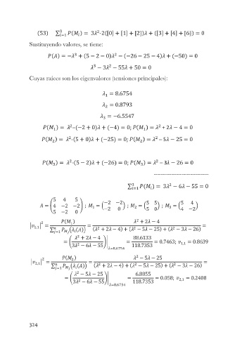 Sustituyendo valores, se tiene: Cuyas raíces son los eigenvalores (tensiones principales): 324
