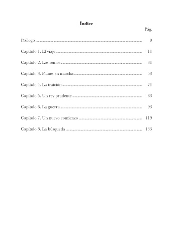 Índice Pág. Prólogo 9 Capítulo 1. El viaje 11 Capítulo 2. Los reinos 31 Capítulo 3. Planes en marcha 53 Capítulo 4. La traición 71 Capítulo 5. Un rey prudente 83 Capítulo 6. La guerra 93 Capítulo 7. Un nuevo comienzo 119 Capítulo 8. La búsqueda 133
