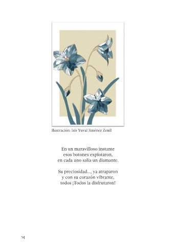 Ilustración: Isis Yuval Jiménez Zenil En un maravilloso instante esos botones explotaron, en cada uno salía un diamante. Su preciosidad…, ya atraparon y con su corazón vibrante, todos ¡Todos la disfrutaron! 14