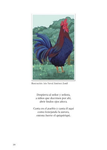 Ilustración: Isis Yuval Jiménez Zenil Despierta al señor y señora, a niños que duermen por ahí, abrir lindos ojos añora. Canta en el pueblo y canta él aquí como festejando la aurora, entona fuerte el quiquiriquí. 20