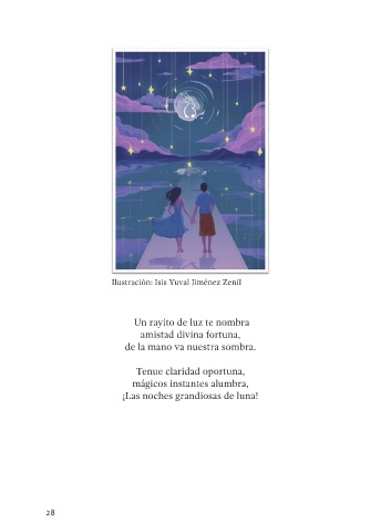 Ilustración: Isis Yuval Jiménez Zenil Un rayito de luz te nombra amistad divina fortuna, de la mano va nuestra sombra. Tenue claridad oportuna, mágicos instantes alumbra, ¡Las noches grandiosas de luna! 28