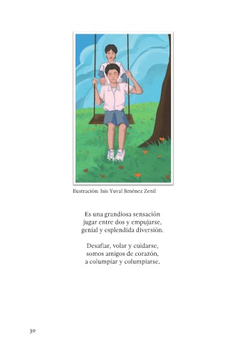 Ilustración: Isis Yuval Jiménez Zenil Es una grandiosa sensación jugar entre dos y empujarse, genial y esplendida diversión. Desafiar, volar y cuidarse, somos amigos de corazón, a columpiar y columpiarse. 30