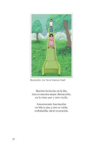 Ilustración: Isis Yuval Jiménez Zenil Muchas fechorías en la fila, ésta es nuestra mejor distracción, en la cima uno y otro vacila. Emocionante fascinación en hilera uno a uno se estila, resbaladilla, ideal recreación. 32