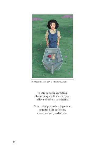 Ilustración: Isis Yuval Jiménez Zenil Y que ruede la carretilla, observen que allá va sin cesar, la lleva el niño y la chiquilla. Pues todos pretenden juguetear, se junta toda la flotilla, a jalar, cargar y a disfrutar. 44