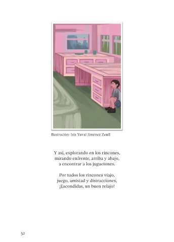 Ilustración: Isis Yuval Jiménez Zenil Y así, explorando en los rincones, mirando enfrente, arriba y abajo, a encontrar a los juguetones. Por todos los rincones viajo, juego, amistad y distracciones, ¡Escondidas, un buen relajo! 52