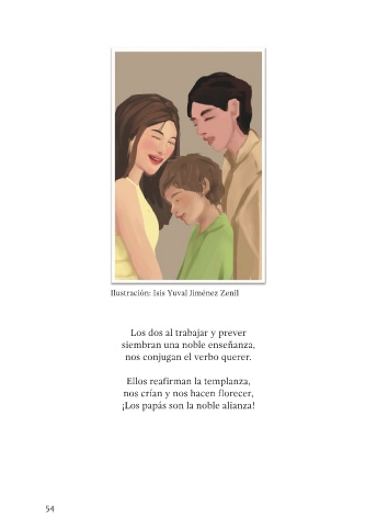 Ilustración: Isis Yuval Jiménez Zenil Los dos al trabajar y prever siembran una noble enseñanza, nos conjugan el verbo querer. Ellos reafirman la templanza, nos crían y nos hacen florecer, ¡Los papás son la noble alianza! 54
