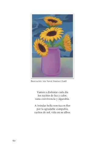 Ilustración: Isis Yuval Jiménez Zenil Vamos a disfrutar cada día los rayitos de luz y calor, sana convivencia y algarabía. A brindar bella sonrisa en flor por la agradable compañía, rayitos de sol, vida en su albor. 60