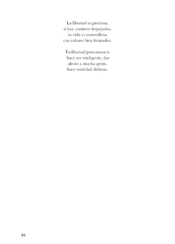 La libertad es preciosa, si hay caminos despejados, tu vida es maravillosa con valores bien formados. Tu libertad portentosa te hace ser inteligente, dar afecto a mucha gente, hace sociedad dichosa. 86