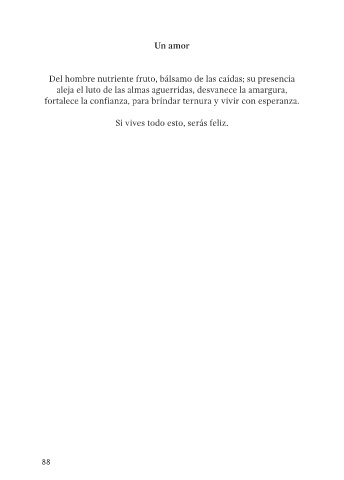 Un amor Del hombre nutriente fruto, bálsamo de las caídas; su presencia aleja el luto de las almas aguerridas, desvanece la amargura, fortalece la confianza, para brindar ternura y vivir con esperanza. Si vives todo esto, serás feliz. 88