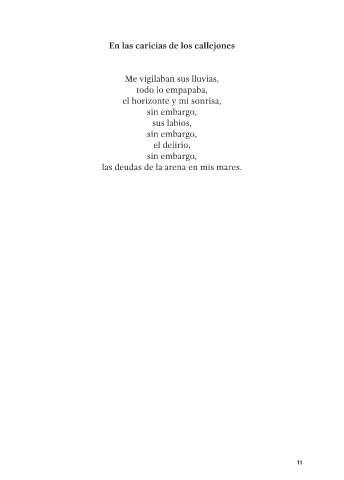 En las caricias de los callejones Me vigilaban sus lluvias, todo lo empapaba, el horizonte y mi sonrisa, sin embargo, sus labios, sin embargo, el delirio, sin embargo, las deudas de la arena en mis mares. 11