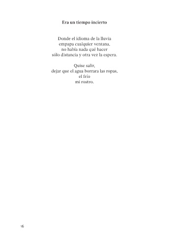 Era un tiempo incierto Donde el idioma de la lluvia empapa cualquier ventana, no había nada qué hacer sólo distancia y otra vez la espera. Quise salir, dejar que el agua borrara las ropas, el frío mi rostro. 16