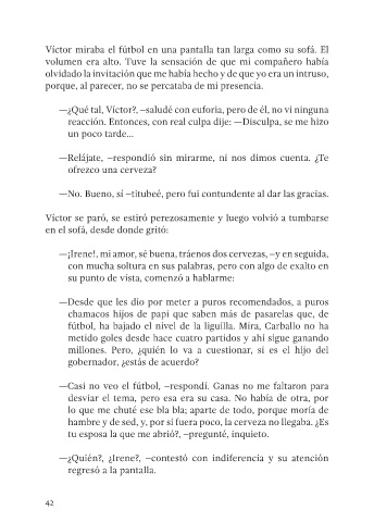 —Casi no veo el fútbol, –respondí. Ganas no me faltaron para