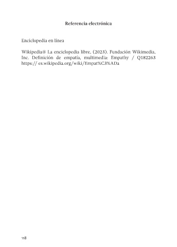 Referencia electrónica Enciclopedia en línea Wikipedia® La enciclopedia libre, (2023). Fundación Wikimedia, Inc. Definición de empatía, multimedia: Empathy / Q182263 https:// es.wikipedia.org/wiki/Empat%C3%ADa 118