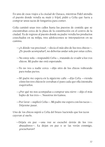 —Por favor —suplicó Celia—. Mi padre me espera con los tacos—.