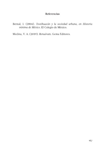 Referencias Bernal, I. (2004). Teotihuacán y la sociedad urbana, en Historia mínima de México. El Colegio de México. Medina, V. A. (2019). Renuévate. Gema Editores. 167