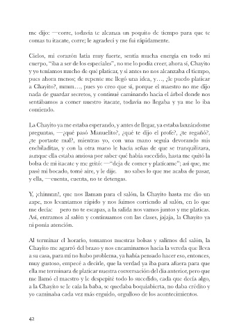 bolsa de mi itacate y me gritó: —“deja de comer y platícame”; así que, me